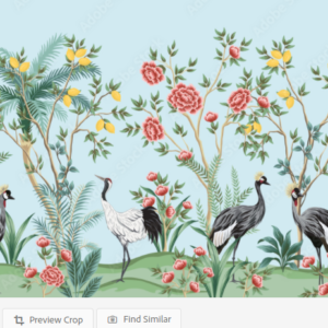 Vintage chinoiserie floral palm tree, fruit tree, plant, crane bird, red roses seamless border blue background. Exotic oriental wallpaper. By good_mood