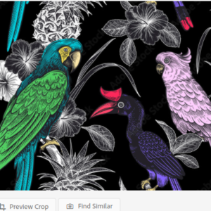 Floral seamless pattern. Tropical birds, flowers, fruits, leaves on black background. Pineapple, parrots, toucans. By marinavorona