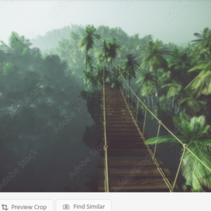 Rope bridge in misty jungle with palms. Backlit. By ysbrandcosijn